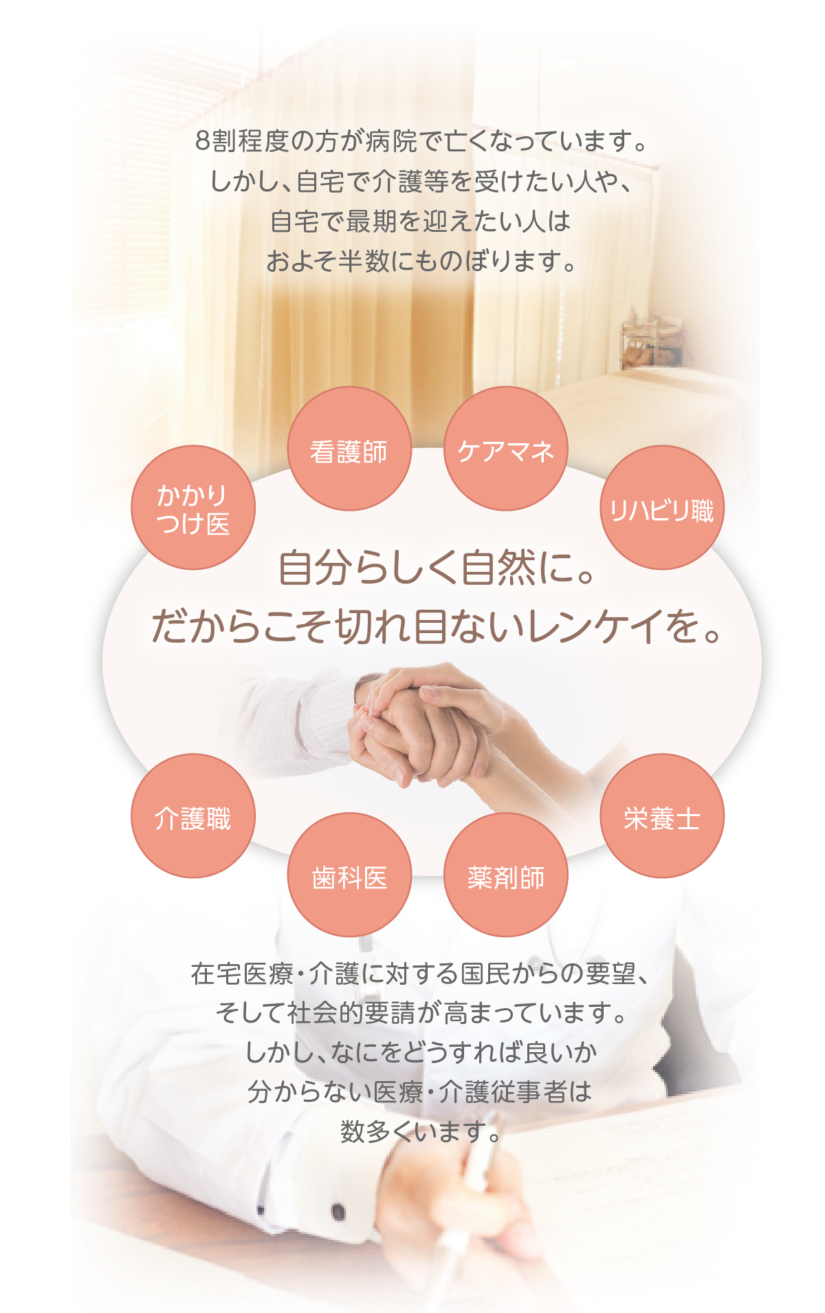 医療・介護間の多職種連携の推進により、切れ目のない在宅医療・介護サービスの提供を実現し、安心できる在宅医療生活が送れるよう支援します。